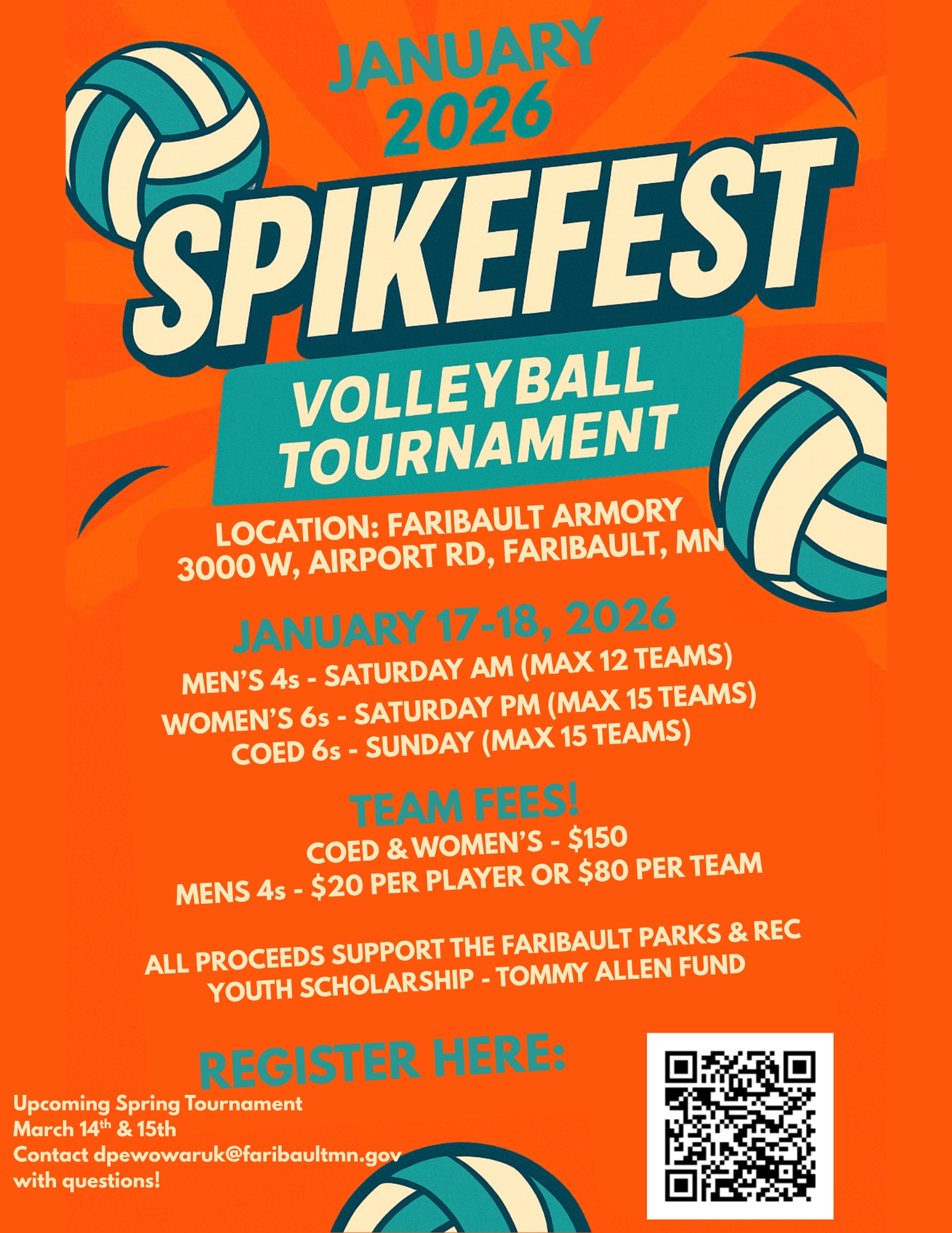 Faribault will be hosting two SpikeFest volleyball tournaments this year (one in January and one in March). We currently have registration open for the January tournament on the 17th and 18th and plan to open registration for March 14th and 15th towards the end of December.